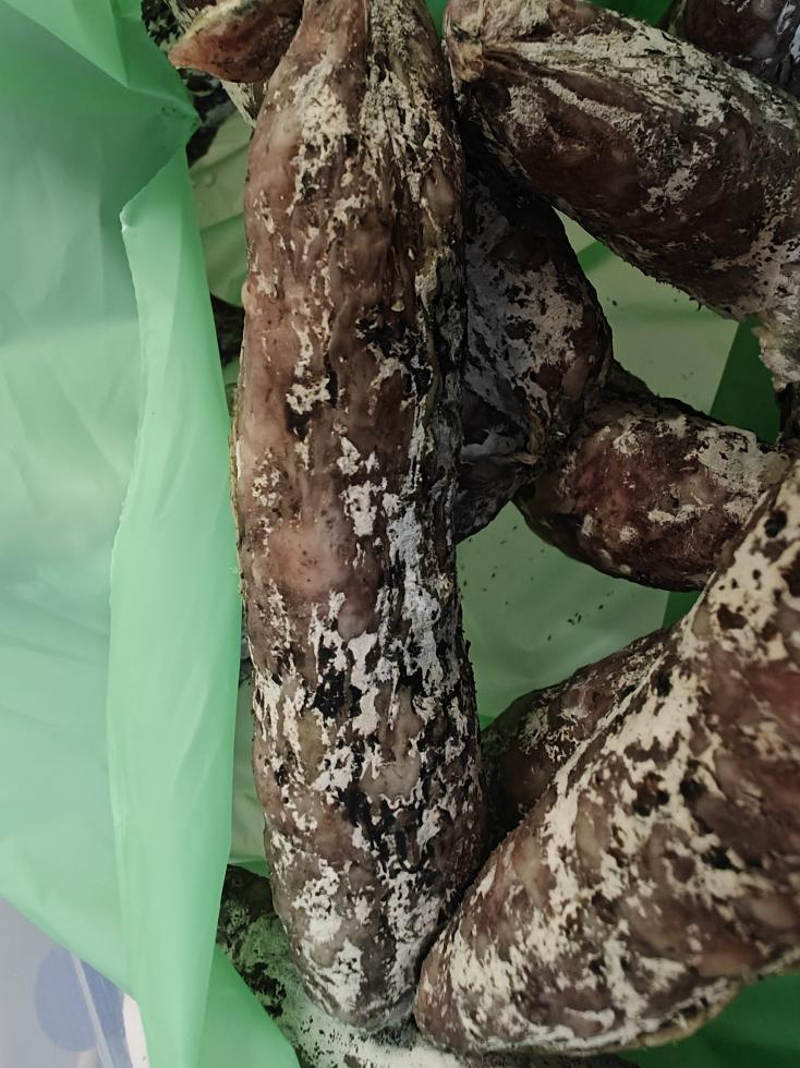 Buonasera a tutti, ho da poco finito la stagionatura di salsicce e oltre la muffa bianca e un po' di muffa verde che ho spazzolato, su alcune salsicce ho trovato della muffa nera sul budello non all'interno. Allego foto se qualcuno può dirmi se sia una muffa dannosa e quindi il prodotto è da scartare o può essere consumato senza problemi