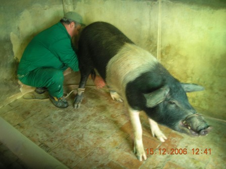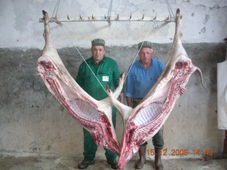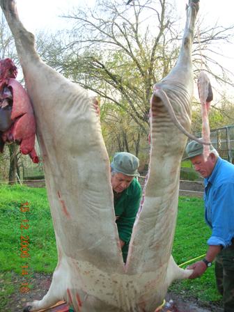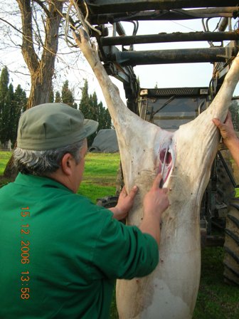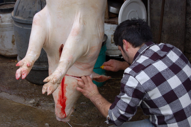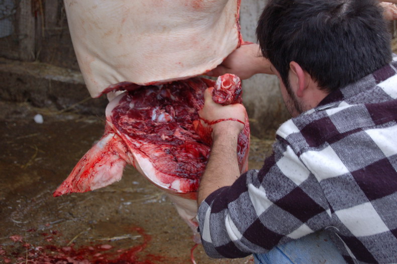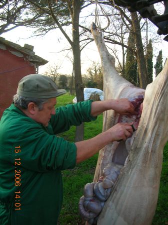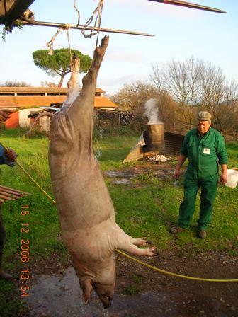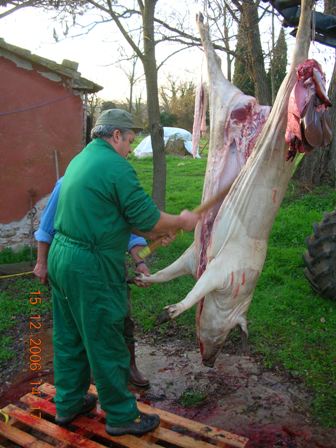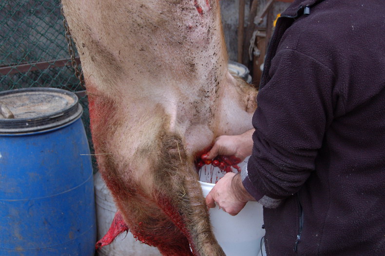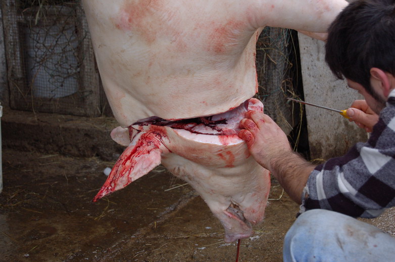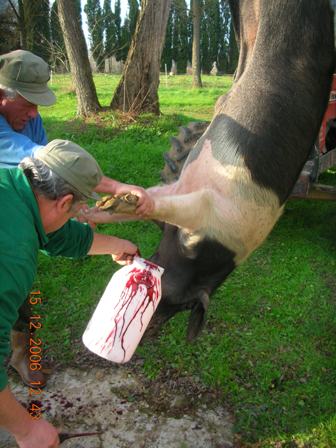 Una volta stordito e sopraggiunta l’immobilità, viene issato per le zampe posteriori con due carrucole e si provoca il dissanguamento recidendo i grandi vasi sanguigni tra collo e petto (tronco carotidale e vena cava anteriore) il sangue viene raccolto immediatamente.