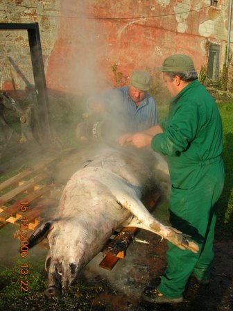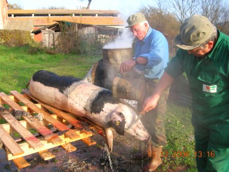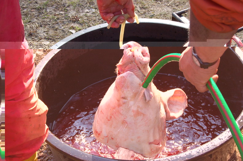 In seguito viene calato sopra una scala appoggiata su un telaio e si inizia la depilazione con raschiatura utilizzando acqua mediamente a 70°C, dettame degli anziani “l’acqua non deve mai bollire due volte”. Si inizia mettendo a bagno i piedi sino a che non si possono asportare le unghie, dopo (noi) si inizia dalla testa, fino alla coscia, con l’ausilio di mestoli e coltelli si raschia la cotenna che rimane bianca e pulita, finito da un lato si rigira sull’altro lato e si ricomincia, e poi una docciatura con acqua fresca per allontanare le setole e lavare la bianca cotenna.