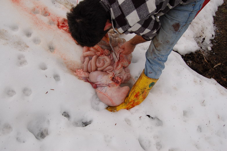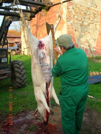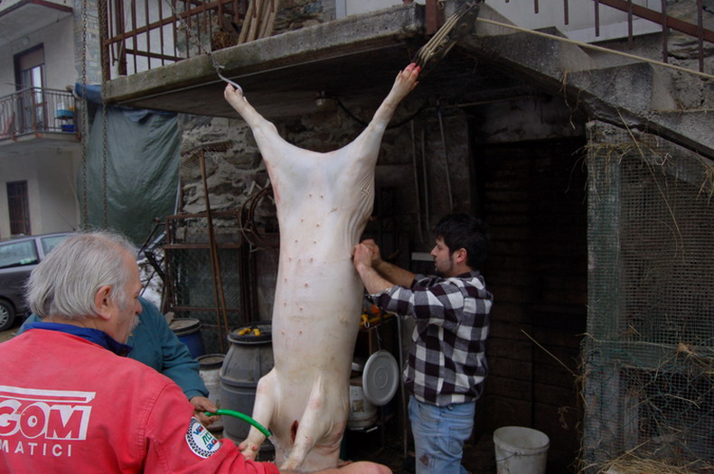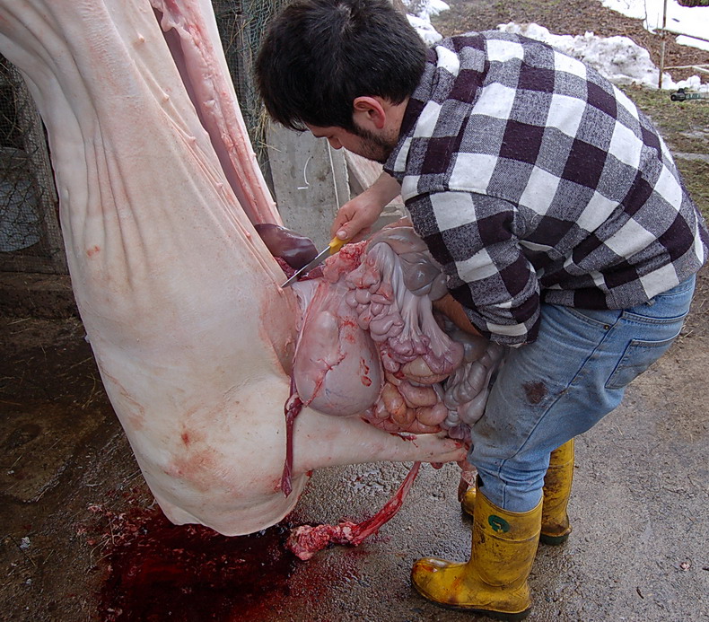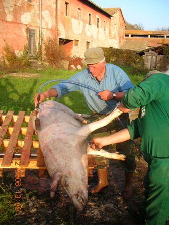 Ciao a tutti, concordo pienamente con voi che lo stordimento deve essere indotto correttamente, l'azione deve essere eseguita da persona esperta e aggiungerei "equilibrata". Io non riesco a parlare con molto distacco di questo momento perciò mi limiterò ad elencarvi quello che facciamo in montagna e per quello che conosco, in tutta la provincia di Sondrio, dove resiste una forte tradizione della Norcineria Casalinga, scusatemi ma, come solito mi aiuterò con delle foto.