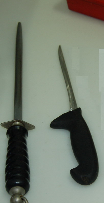 1 Disossare curvo 2 Scannare 3 Affettare 5 Acciaino Abrasivo 6 Acciaino x Ravvivare 7 Scuoiare e Rifilare 8 Disossare Che mondo sarebbe senza Orione  ...l'unica cosa che mi lascia perplesso riguarda lo scannatore...mi sembra troppo sottile e delicato (apparentemente sembra quello per affettare il prosciutto...ovviamente, non avendolo in mano, magari la flessibilità è solo apparente)...sarà perché noi usiamo scannatori del genere: