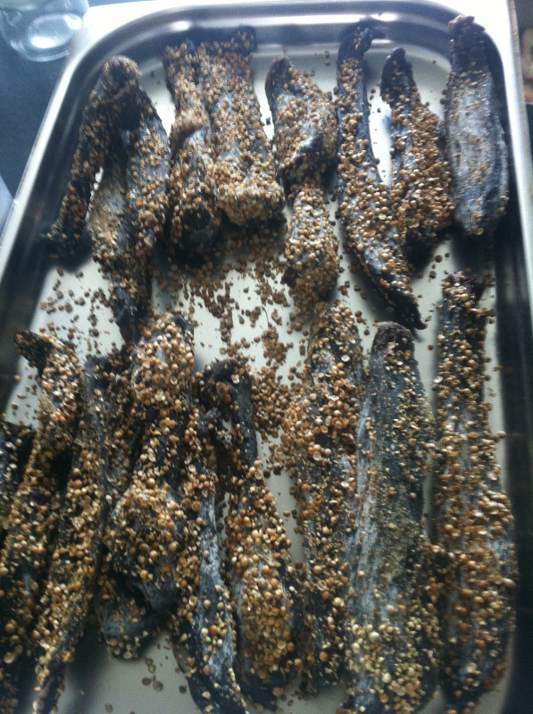 ciao a tutti nel ristorante dove lavoro facciamo questo tipo di carne secca molto saporita e particolare, molto semplice da eseguire: necessitiamo di: sfilacci di carne di manzo magra (noi usiamo lo scamone), una miscela al 50% di semi di coriandolo secchi e pepe nero in grani tutto passato grossolanamente al mortaio basta quindi impanare gli sfilacci di manzo nella concia in modo da coprire tutti i buchi, appenderli a dei gancetti di ferro e mantenerli per 1-2 settimane in base alla pezzatura ad una temperatura di 45-50 gradi con umidità il piu basso possibile, ne risulterà un prodotto asciutto il cui sapore ricorda la bresaola ma con un bel tono di pepe nero e coriandolo, leggermente sciapo per la mancanza di sale, ottimo accompagnato con sottaceti e aperitivi...ecco le foto del risultato! purtroppo non posso fare foto alla produzione perchè lo chef non vuole che si facciano foto in cucina....
