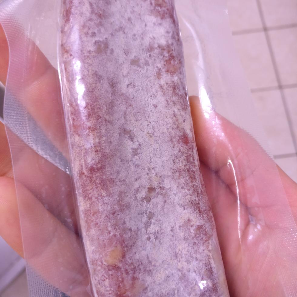 buonasera volevo porvi un difetto da me riscontrato, dopo aver messo sottovuoto la soppressata a distanza di un mese si presentano questi cristallini sotto il budello (vedere allegato), hanno la consistenza di un sale molto sottile, ma sale non è :roll: