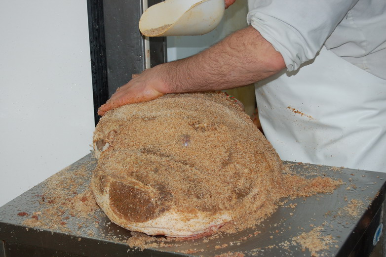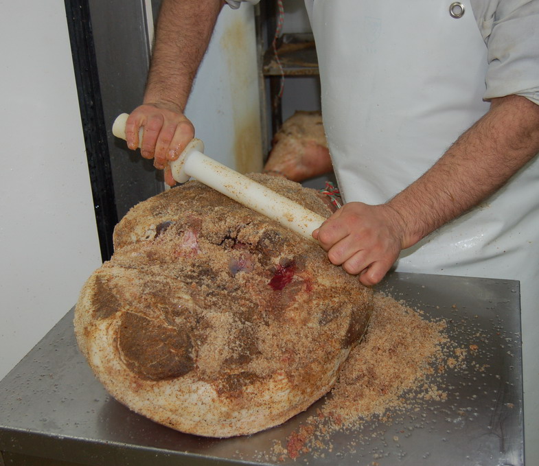 Salagione; Si procede poi con abbondante sale aromatizzato all'operazione di salatura/sfregatura, sale umido sulla cotenna e sale secco per le parti muscolari, per primo sulla cotenna e sul grasso circostante l'arco del prosciutto, sulla cotenna il sale va sfregato a dovere, senza fare economie. Si chiama sfregatura proprio perché il sale per rimanere sul prosciutto deve essere preso in mano e premuto sulle parti con movimenti ampi che assomigliano ad un massaggio. Non basta appoggiare il sale, occorre premerlo e sfregarlo con vigore. Mentre sulla parte magra superiore, tutta la zona rossa intorno alla testa del femore, basta tirare il sale che rimane naturalmente appoggiato sul prosciutto senza sfregare con forza.