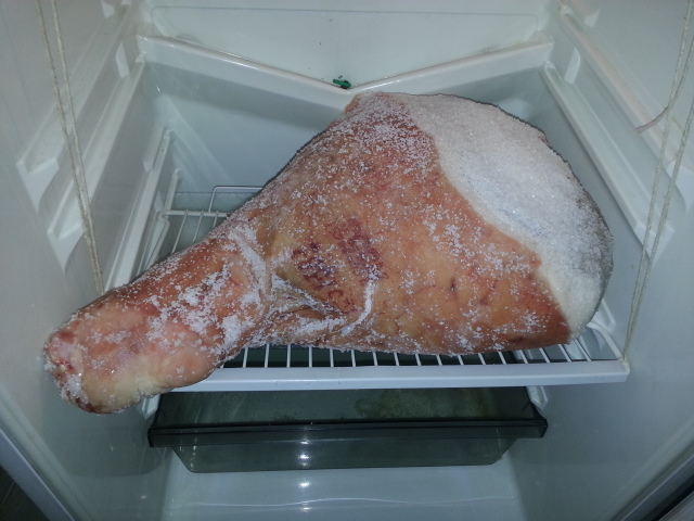 Ecco qui il prosciutto al 5o giorno di salagione. L'ho messo in frigor su piano inclinato.