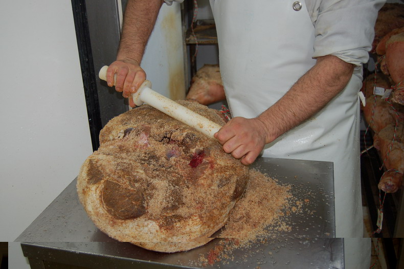 Il MASSAGGIO: Il massaggio non è finalizzato alla penetrazione del sale, ma allo “svuotamento” delle due arterie principali presenti nella coscia. Ristagni anomali di sangue possono compromettere il processo di stagionatura e portano inevitabilmente a prodotti di scarsa qualità. In questa fase come in quella di sagomatura e rifinitura delle cosce ha notevole importanza la capacità manuale dell’operatore, che deve esercitare una particolare e sapiente pressione manuale sulla massa della coscia per agevolare lo spurgo dell'arteria femorale e trasversale.