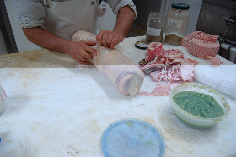 Come parte grassa si utilizza, Lardo di Schiena e Guanciale, il procedimento per la loro lavorazione prevede che siano tagliati a filetti da un centimetro di lato per 20/30cm di lunghezza, preventivamente salati e insaporiti, lasciati riposare almeno una notte, quindi tagliati a punta di coltello in dadini, in quantità del 10-15% rispetto alla parte magra.