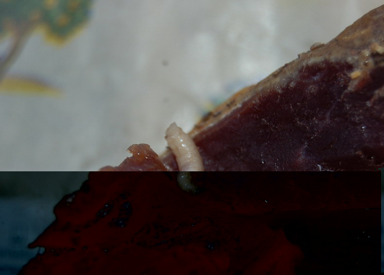 Purtroppo un moscone è entrato in cantina, gli ho sparato con la "doppietta" ma intanto era riuscito a depositare le sue maledettissime uova, ed eccone i risultati. In un prosciutto ho già tagliato tanta carne che entra il mio polso, ho lavato con aceto di vino, lasciato asciugare, messo un p'ò di sale e poi una bella impepata, pensate abbia risolto o dovrei fare altro? ciao e grazie.