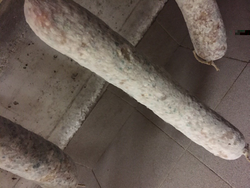 Buona sera a tutti, sono Diego, neo registrato è un neo hobbista norcino da quest'anno. Ho fatto dei salami a dicembre che sto mangiando con soddisfazione cosichè ho deciso di farne ancora nel mese di febbraio. Li ho insaccati domenica 15 e li ho messi nello stesso ambiente di una decina di salami che mi sono rimasti della partita precedente. ho cercato di mantenere i salami ad un'umidità di circa 85% leggermente più abbondante nei confronti di dicembre perchè ho notato una stagionatura non omogenea nei salami di dicembre. Da circa 5 giorni hanno cominciato a coprirsi di muffa... Bianca ed asciutta... Ma con l'avanzare del tempo sempre più in dosi massicce. Fino a 3 giorni fà che comincio a notare della muffa verde. Allora preoccupato cerco di ventilare tenendo un ricircolo d'aria costante e abbassando l'umidità, ad oggi portata al 76%... muffa bianca che copre la totalità del salame con puntini verdi... Al tatto morbido, asciutto e non appiccicoso.. Tengo a precisare che non utilizzo alcun tipo di conservante, solo sale e pepe e i salami sono in una stanza seminterrata pavimentata con pareti in cemento grezzo. Per mantenere l'umidità controllata ho circondato le pertiche con una tenda che se necessario bagno, oltre a tutto questo bagno per terra della sabbia a bisogno. Più tardi posto delle foto per valutare meglio l'entità della muffa.(come faccio a caricare un'immagine?) Grazie!!!!