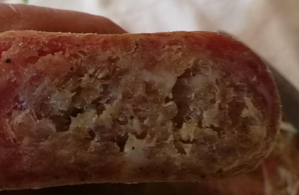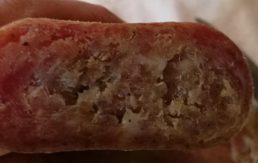 Oggui hio aperto un salame, insaccato una ventina di giorni fa e tenuto a temperatura ed unidità contollata. E' stato messo sotto pressa. All'esterno è bello rosso, con carne compatta, mentre all'inerno la carne è bianca/gialla; all'estreno ha un sapore quasi buorno, mentre all'interno ha un sapore quasi da schifo. Dove ho sbagliato?