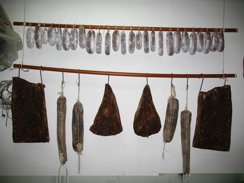 Eccomi qua...riporto quanto avevo già scritto l' anno passato in quanto non ricordo con esattezza quanto abbiamo prodotto dal maiale di quest'anno. Quest' anno la bestia pesava 250kg mentre l' anno scorso pesava vivo circa 220kg quindi: _circa 70kg tra salami e sopresse comprese 4 sopressette col filetto (l' ho diviso a metà) _circa 20kg di cotecchino _4 coppacollo con pancetta (ho diviso le 2 coppe in quattro e le ho arrotolate nelle 4 pancettine che ho ritagliato) _1 linguale (lingua inserita in un cotecchino) _circa 6kg di salsicce _martondee (cuore,carne insanguata, polmoni (frattaglie) macinate condite e come polpette, avvolte nel RAISEO(membrana sierosa o peritoneale)) Saluto a tutti i norcini gian