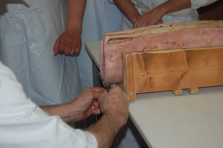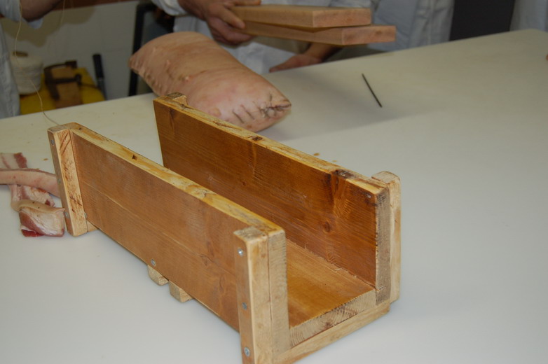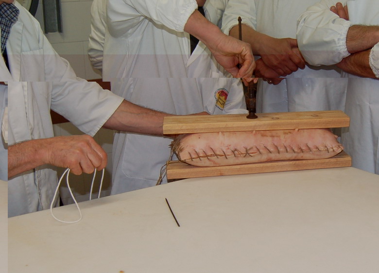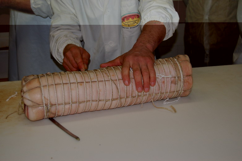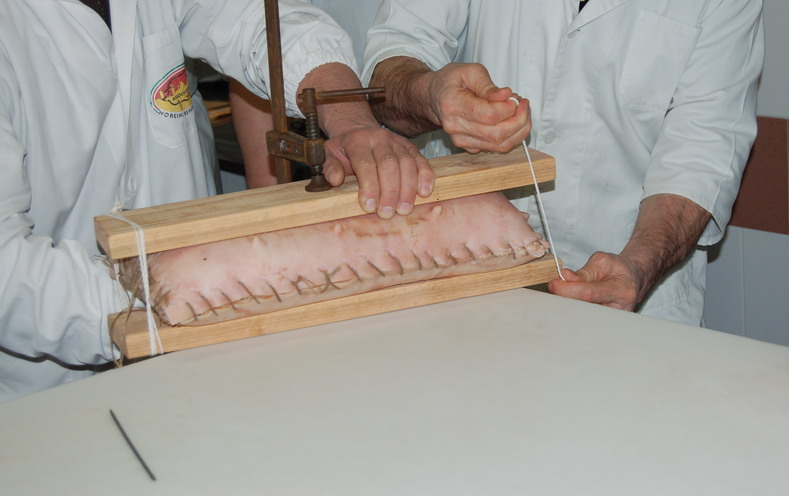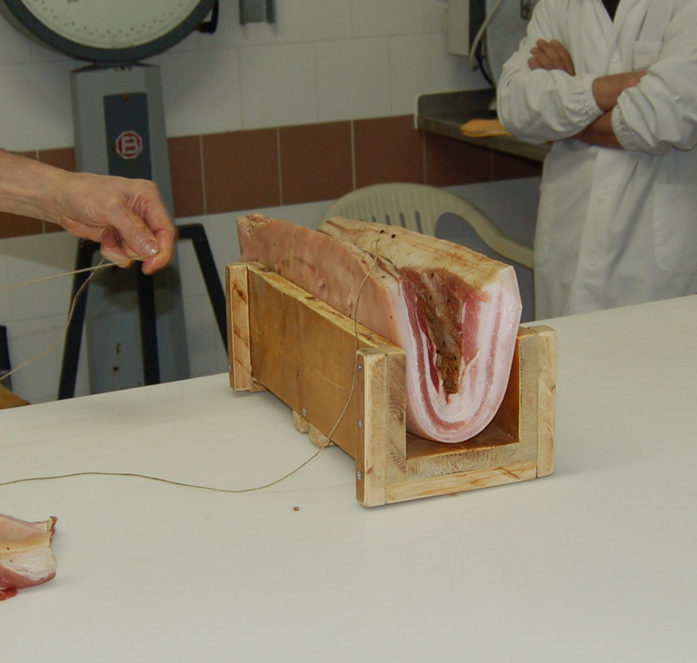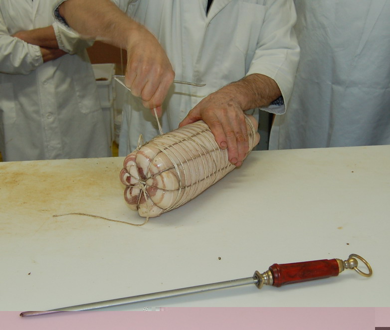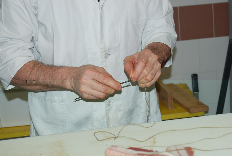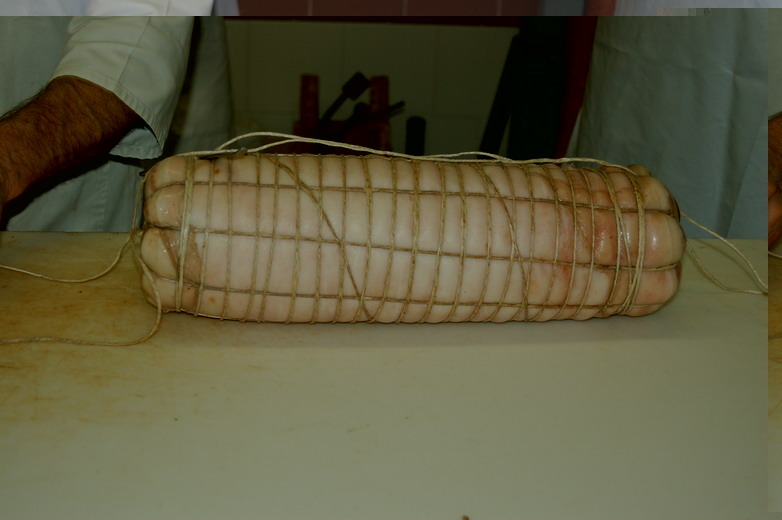In fine si prepara per la legatura, si puliscono/spennellando le superfici della pancetta e si rifila.
