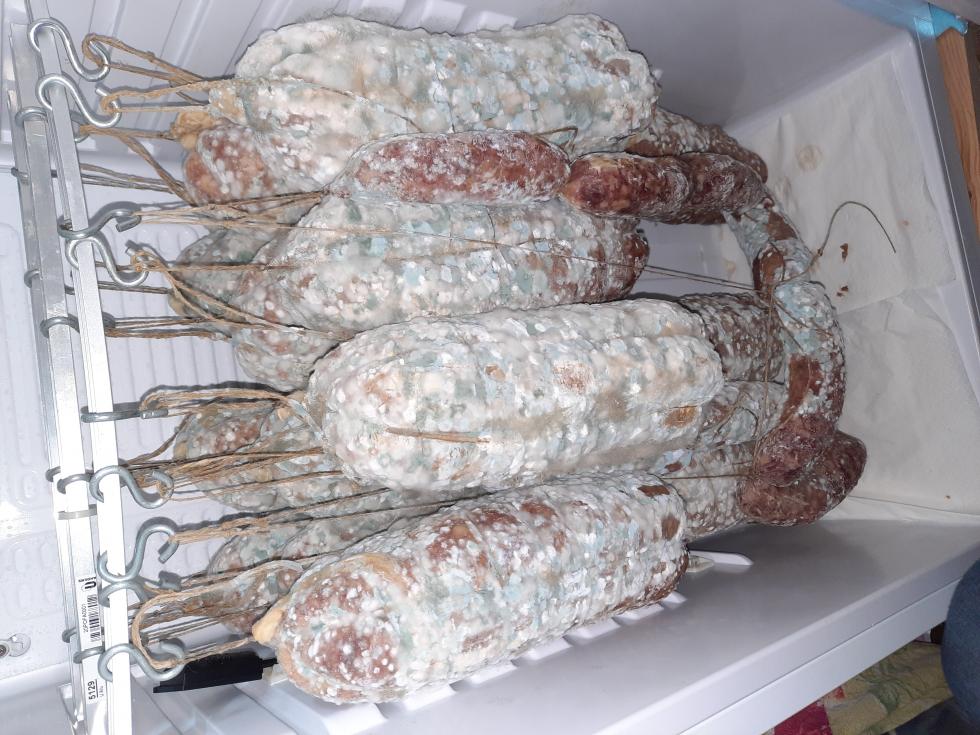 Buongiorno a tutti. Un mese fa mi sono cimentato nella produzione di salami (dopo 2 prove riuscite discretamente). Al momento della stagionatura hanno cominciato a fiorire le prime muffe, bianche.... Poi purtroppo causa polmonite sono stato ricoverato in ospedale e non potendo controllare i miei salami, queste muffe bianche hanno cambiato colore, da bianco sono diventate verdi e poi successivamente nere. Appena rientrato a casa ho effettuato la spazzolatura e pulitura con acqua e aceto ma leggendo qua e là temo che il danno sia irreversibile. Chiedevo consiglio a voi più esperti. Dal momento che ho usato il budello pelato di scrofa che è un po più spesso, dite che forse si potrebbe essere salvato il salame? E queste muffe nere da cosa dipendono? Grazie a tutti per le risposte.