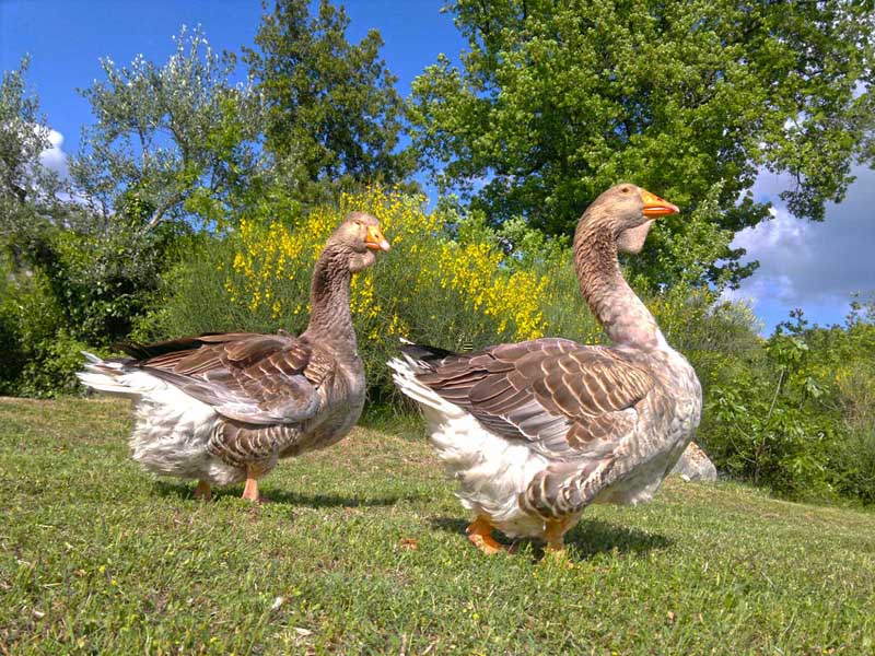 Dopo una estenuante ricerca, sono riuscito a trovare questi due esemplari di tolosa industriale, il maschio è quello avanti e ha tre anni, la femmina ne ha due, forse non saranno bellissimi ma ero stanco di cercare e per cominciare mi accontento. provengono da allevatori differenti e quindi si sono conosciuti una settimana fa. non avendo esperienza con le oche chiedo se potete aiutarmi a chiarirmi qualche piccolo dubbio. 1-ho notato a differenza dei brahma che allevo, che non mangiano continuamente, ma saltuariamente e anche l'erba non è che è presa d'assalto come mi sembrava di aver capito facessero, qual'è l'alimentazione secca migliore? 2-la femmina quando sono in acqua spesso prende il maschio per il collo come se volesse affogarlo e sembra quasi voglia coprirlo, ma lui solo una volta ha risposto montandole sopra senza peraltro fare nulla; 3-il periodo di deposizione di questa razza in particolare, mi sembra di aver capito inizi a febbraio, ma allevatori della mia zona (umbria) mi dicono che quest'anno le loro oche (non tolosa) ancora non hanno cominciato a deporre, da quali atteggiamenti posso dedurre che la coppia si sia formata, e se ciò avviene generalmente dopo quanto tempo? grazie a tutti