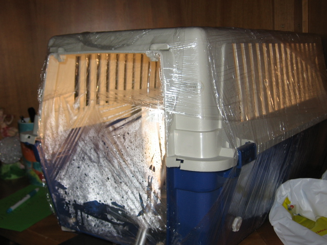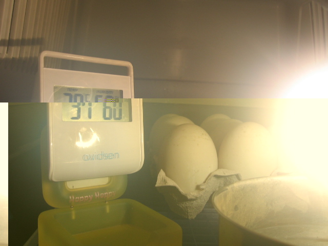 Questa invece è l'incubatrice, da dentro e da fuori. La temperatura è costante tra i 37 e i 38, l'umidità varia dal 60 al 70 %. Fuori dall'incubatrice, in corrispondenza dei fori sulla pellicola, c'è una piccola ventola che aziono spesso per favorire il riciclo dell'aria. Speriamo che funzioni