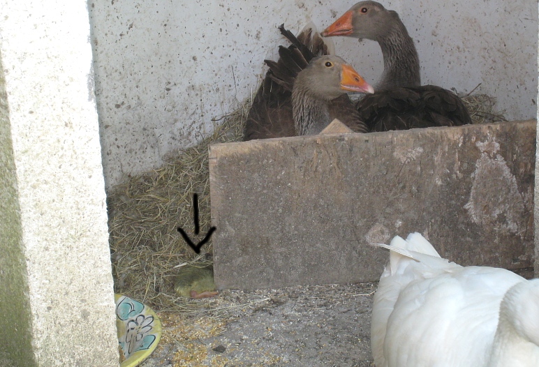 Buongiorno a tutti, mi inserisco in questo argomento perchè anche la mia oca ha covato tanto e da ieri ho visto movimenti strani intorno al nido. Ho tre maschi e due femmine. Il cambiamento è stato che quando sono andata ad aprire il recinto per farli uscire, i maschi non sono usciti e l'altra femmina, sebbene ad intermittenza, si è messa a trafficare e a covare accanto alla prima, come a darle una mano. Stamattina idem, l'altra femmina sempre nel nido accanto alla covatrice. Mi sono appena avvicinata e ho visto che è nato un papero  che gioia! Il fatto è che questo piccolo si trova lontano dal calore della mamma, chissà se ce la farà. Freno qualsiasi iniziativa perchè ho imparato che è bene non interferire con la Natura, c'è la mamma, sapranno cosa fare. Inoltre i maschi già normalmente molto aggressivi, sono protettivi al massimo. Se qualcuno ha esperienza in queste cose, mi può dare qualche suggerimento? Vorrei sapere se devo somministrare il mangime primo periodo che poi andrebbero a mangiare anche gli adulti e se devo mettere una ciotolina di acqua nei pressi del nido oppure cosa altro posso fare. Monique spero che la tua chioccia riesca a far nascere i piccoli, a me una chioccia in passato ha covato e si è presa cura di 2 anatroccoli, quindi in bocca al lupo! Ciao Susanna Allegato: