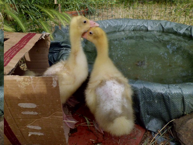 Ho 2 pulcini di oca bianca di circa 20 giorni, sui quali ho notato una cospiqua perdita di piumaggio sul dorso. Non so se sia fisiologica muta del piumino oppure una patologia, ad esempio parassitosi o dermatite. Comunque non si grattano nè sembrano infastiditi. Adesso provo a postare delle foto.