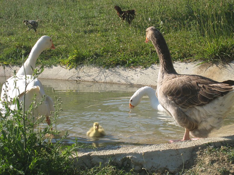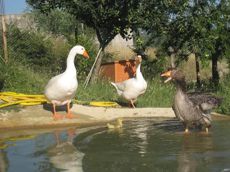 sarebbero stati 4 se avessi separato le due femmine che hanno rotto le uova e schiacciato 3 paperi in fase di schiusa. Una pena quando me ne sono accorta  fortuna però che un uovo era ancora integro e il piccolo aveva bucato. L'ho messo in incubatrice, ho capito che dovevo aiutarlo, il suo tempo stava finendo. Il 15 giugno sera è nato Salvo "per ora" che ho lasciato in incubatrice fino al mattino seguente. Sono stata attentissima a non dire neanche una parola per far si' che il primo richiamo che si imprintasse nel suo istinto fosse quello del verso della madre, così il 16 pomeriggio l'ho portato a lei. Non dimenticherò mai gli occhi di quell'oca che guardava il suo unico piccolo papero che neanche si reggeva sulle zampine e faceva vi vi vi. Erano tutti impazziti ma l'altra femmina e i maschi li ho lasciati fuori dal recinto per un intero giorno finchè ieri tutti sono stati attentamente riuniti. Salvo "per ora" è trattato dagli adulti con l'attenzione e la delicatezza di un tanto atteso figlio unico. Osservare le dinamiche di questa famiglia di oche ha dell'emozionante. Allegato: