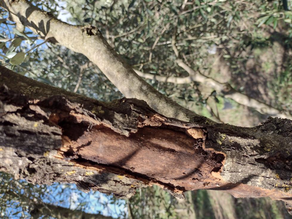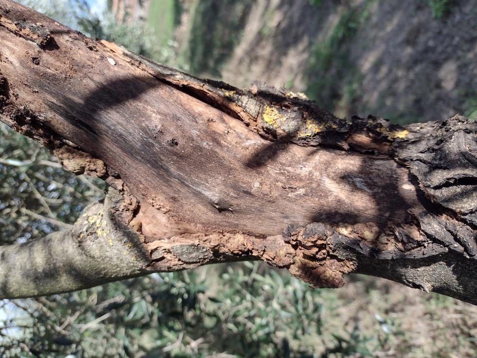 Concordo con Alessandro per la prima foto, che indicherebbe la rogna. Mentre sotto, ravviso la carie dell'olivo (poi hispanico mi correggerà). Nella parte superiore, per il primo caso, potatura moderata col freddo e disinfettando frequentemente l'attrezzo di taglio. Il freddo limita la diffusione della malattia.