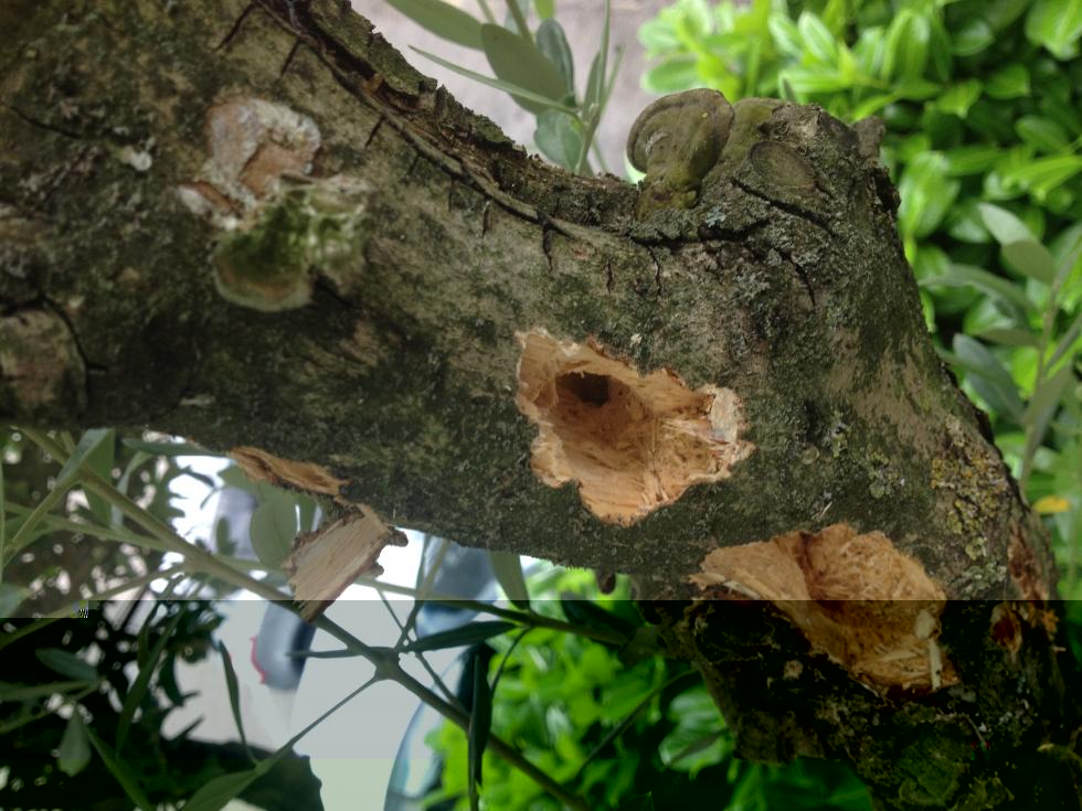 in realtà quelli indicati dalle frecce sono buchi, come se un verme fosse passato. ipotizzando fosse proprio un picchio cosa devo fare per provare a salvare il ramo? ancor prima come posso sapere che l'ipotetico picchio abbia fatto pulizia? è il caso che tagli il ramo per evitare che si diffonda oltre? Usare del mastice potrebbe essere indicato? cosa posso utilizzare per provare a "pulire quei buchi" per evitare che gli/l'ospiti/e indesiderati restino nel ramo?