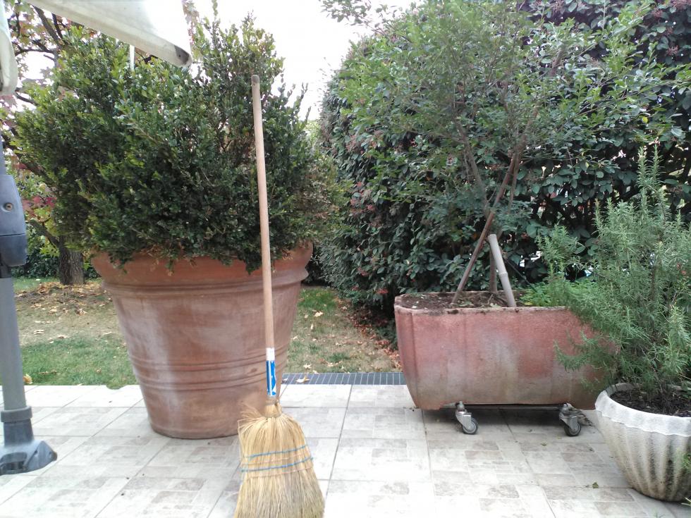1) A sx è un grosso vaso in cotto toscano (ne ho tre così, li pagai una cifra non da poco ma effettivamente resistono al gelo e non si sbriciolano): in due siamo riusciti a spostarli facendoli giarare a perno sui margini della base, ma è stato di pochi metri e sulla pavimentazione: ho appoggiato una scopa per dare una idea delle misure (è in primo piano e la prospettiva la fa apparire più grande di quanto non sia in realtà)