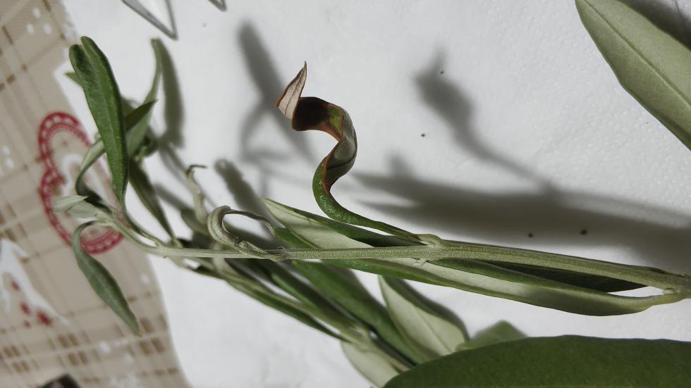Salve a tutti, quasi tutti gli olivi di questo oliveto presentano foglie dei germogli arricciate in questo modo (come da foto)... Cosa può essere? Tripide dell'olivo? Le foglie sono secche alla punta e ai primi bordi tanto da arricciarsi. Dico anche che gli olivi sono colpiti nei rami meno vigorosi, secondo le mie conoscenze da fleotribo... Oggi pomeriggio pubblico foto di una larva trovata nel legno, bianca bella tonda e lunga 2 mm circa. Sapete aiutarmi? Grazie..