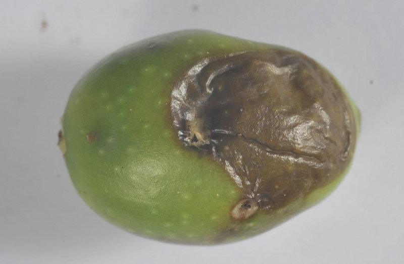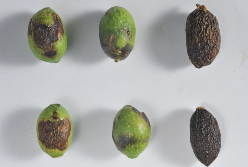 1) Aspetto dell'oliva: la tacca è in zona equatoriale e appare come un'area depressa e molto scura 2) Sviluppo di corpiccioli neri sulla tacca in forma verosimilmente di picnidi (sono diversi dagli acervuli) emettenti cirri (masserelle gelatinose arricciate) che al microscopio si risolvono in masse di conidi 3) Aspetto dei conidi