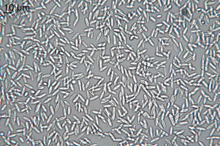 La prime due foto allegate riguardano il campione di Forzaspal: si conferma Colletotrichum acutatum. La colonia su piastra è di colore tendenzialmente aranciato (come di regola) e i conidi hanno apici appuntiti.
