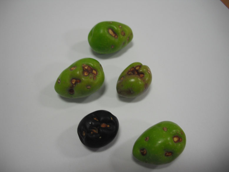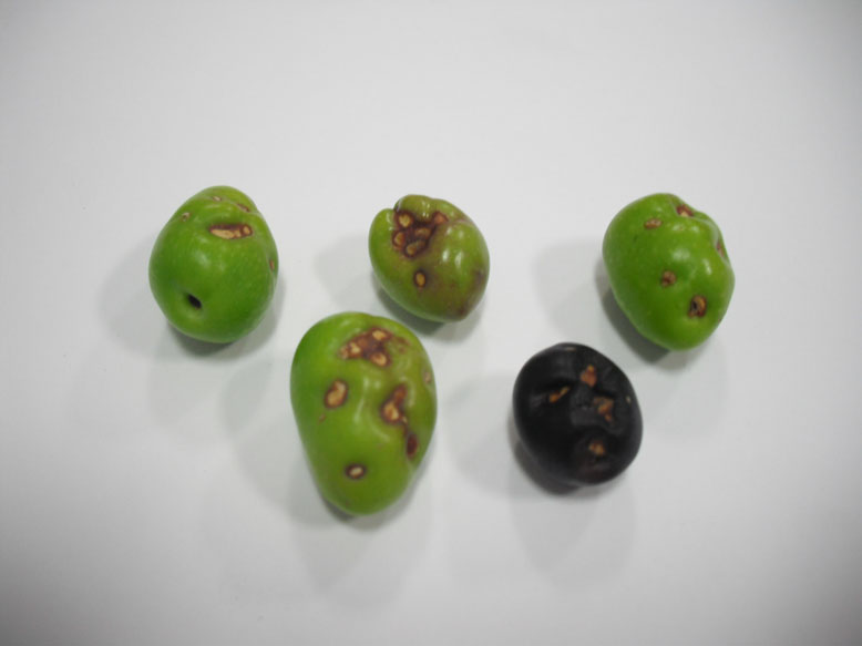 Dovresti vedere se sull'albero ci sono bolli come questo.  Se ci sono, dovrebbero essere stati causati da grandine. L'altra prova che potresti fare è tagliare le olive sotto ai bozzi per vedere se ci sono larve (anche se non dovrebbero essercene).