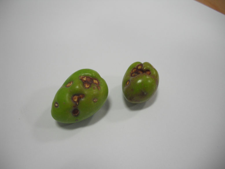 Verifica che non sia un attacco del Rinchite dell'Olivo; in genere, in seguito all'attacco del rinchite, rimane una depressione crateriforme sulla drupa.