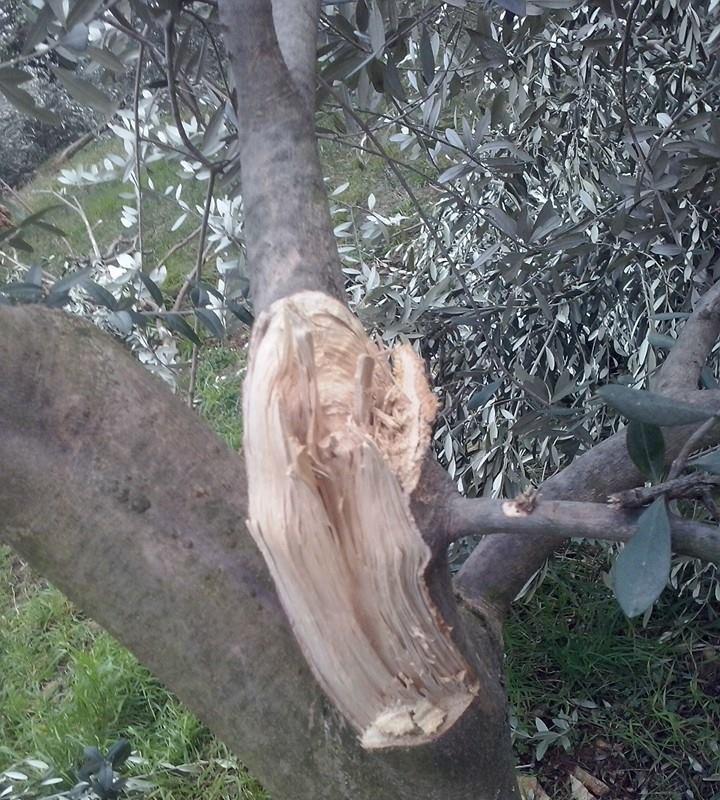 L'olivi con branche principali spezzate o rovinate, sarebbe utile rimuovere i ramispezzati, dovresti "piallare", in modo da evitare che l'acqua o l'insetti non compromettano ancora di più il danno in futuro, sulle ferite puoi cospargere mastice per innesti o vernice.......infine una bella disinfettata con poltiglia bordolese non fa mai male.