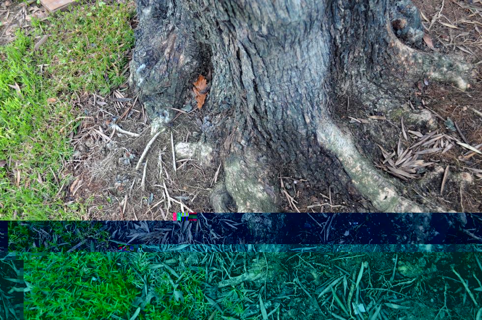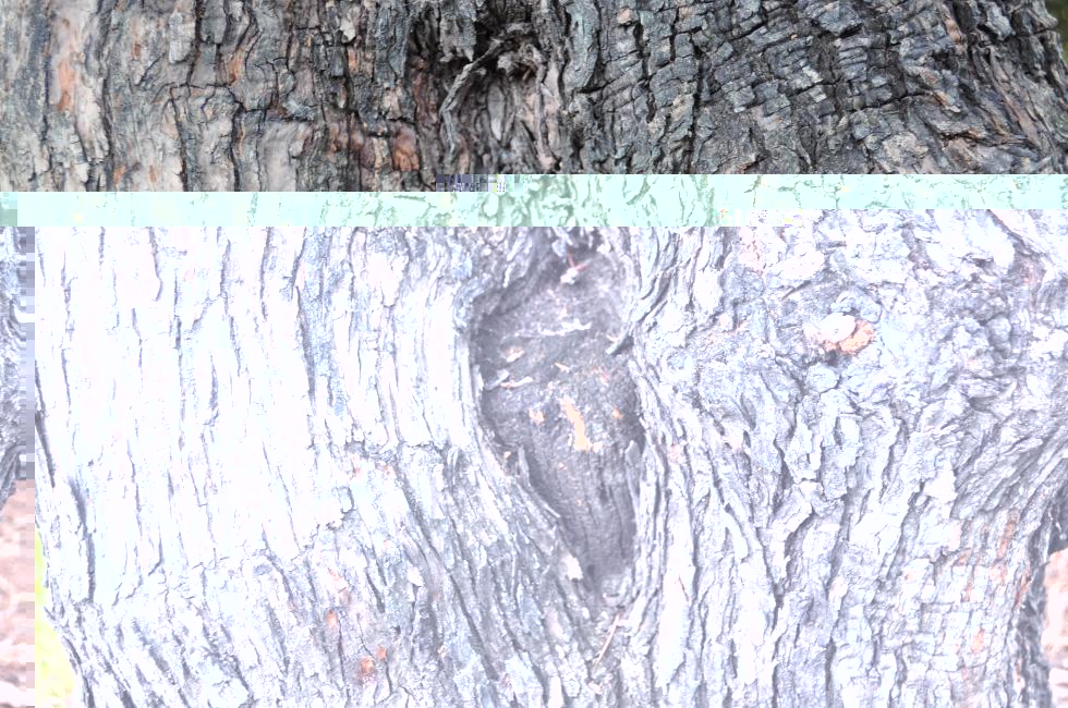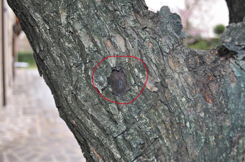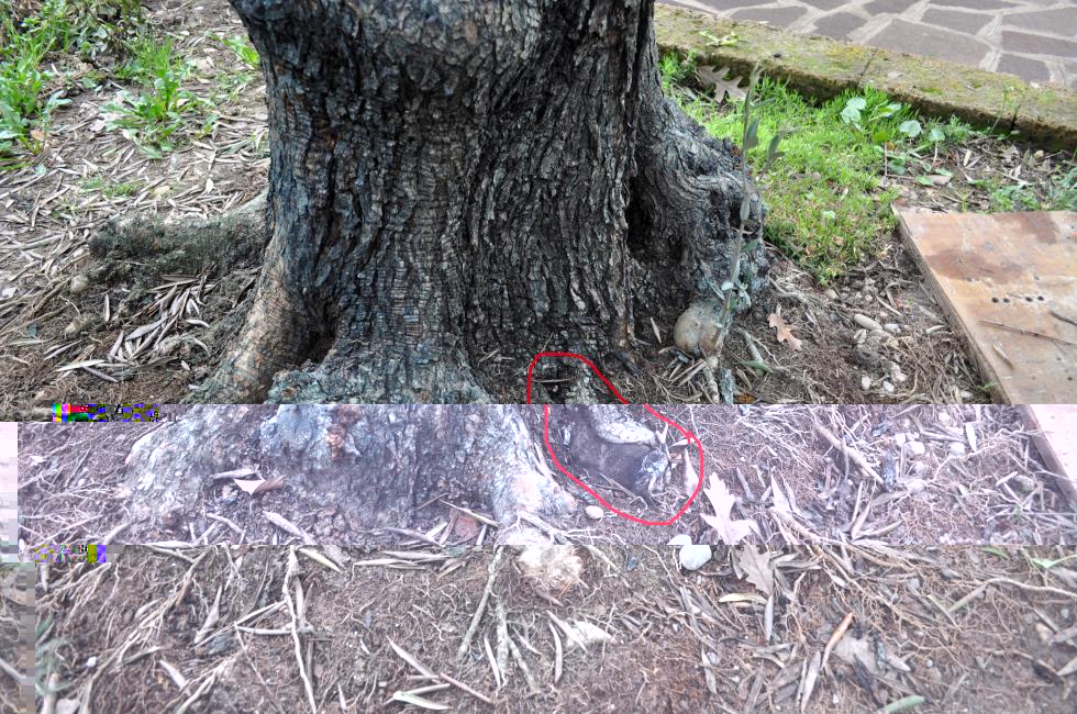 Metto una foto dell'albero intero dove ho evidenziato una zona senza corteccia e dallo stesso lato si presenta lo stesso problema anche in basso nella zona delle radici ( non so come si chiama in termine tecnico ) . Di seguito metto i particolari. Da quella zona evidenziata in alto, in estate quando fa molto caldo, esce una roba densa gommosa di colore scuro. si vede dalla corteccia annerita