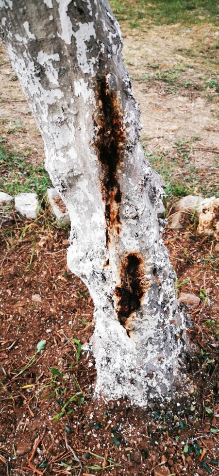 Buonasera a tutti tempo fa ho trovato su un tronco di un ulivo delle macchie scure che sembravano formate da un liquido appena me ne sono reso conto ho provato a disinfettare con della calce ma come potete vedere dalla foto il problema non l'ho risolto aiuto perfavore grazie a tutti