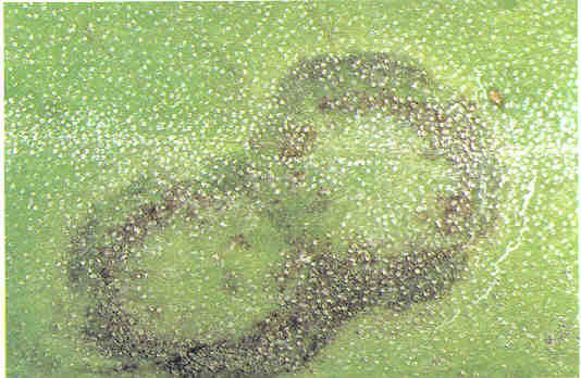 Alessandro1944 ha scritto: I trattamenti rameici vengono diretti principalmente contro l'occhio di pavone, e il criterio è simile a quanto si fa sulle drupacee: con decorso stagionale 'normale' un intervento a titolo estintivo dopo le piogge autunnali e uno a fine inverno-inizio primavera a titolo preventivo per eliminare quanto più inoculo possibile (le condizioni di infezioni sono: optimum termico 12-15 °C e U.R. elevata). E' possibile anche intervenire con infezione in atto in estate-inizio autunno: in questo caso il rame provocherà una defogliazione delle foglie colpite per un particolare meccanismo fitotossico del rame sul mesofillo infetto ma contestualmente una parziale azione eradicante del patogeno. Si può effettuare una diagnosi precoce, ove si abbia il sospetto o il timore di infezioni, immergendo campioni di foglie apparentemente sane in una soluzione al 5% di NaOH o KOH per un paio di minuti o poco più a temperatura ambiente per foglie giovani o più a lungo e in soluzione leggermente calda (50-60 °C) se le foglie sono più vecchie: nei punti dove è presente il fungo compaiono delle areole brunastre (vd. foto da rete).