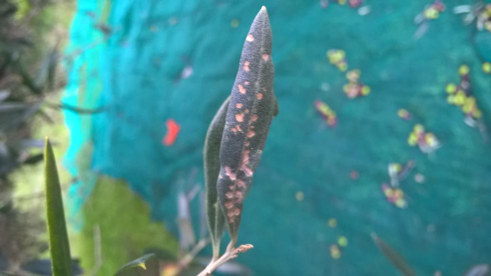 Rieccomi qua. Ho tagliato il ramo incriminato e potete vedere la sezione qui sotto. In quel terreno, praticamente tutte le piante hanno la rogna. Ma non credo che faccia seccare un ramo così. Anche perché quella pianta ne aveva poca. Se serve vedere la pianta nella sua interezza, metto anche il link di un breve video. A proposito di rogna. Oggi ho fatto una pianta stracarica di olive e di bubboni. Ma quello in primo piano nella seconda foto, cos’è? Poi molte foglie di molte piante sono punterate, come nella terza foto. È il segno di qualche malattia o sono normali così? Queste piante comunque, per quanto malate possono essere, non danno problemi e si riprendono da sole. Le piante che mi preoccupano sono nell’altro terreno. Quando finisco in questo terreno, passo nell’altro e vi chiederò una diagnosi di quelle.