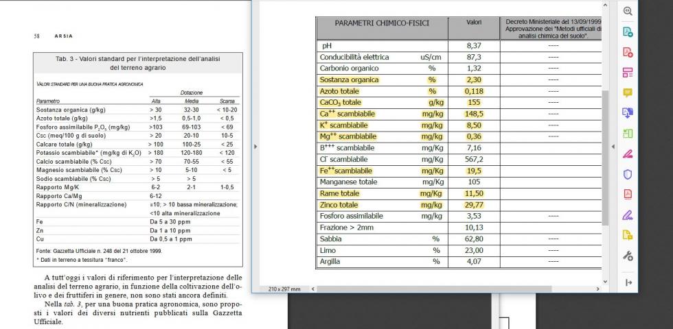 Buon pomeriggio a tutti, sul web sto leggendo parecchio sulle carenze che possono avere i terreni, con situazioni simili alla mia dove per anni non sono state effettuate concimazioni ed integrazioni di nutrienti per gli ulivi. Sto cercando di fare un raffronto tra valori per così dire "standard per l’interpretazione dell’analisi del terreno agrario" e le analisi che ho ricevututo dal laboratorio; ho trovato sul web questo utilissimo strumento http://www.olivoquercetano.com/Fertilizzazione%20olivo%202006.pdf e del quale vi faccio un breve riassunto in questa immagine. Al lato sinistro i valori standard e sul lato destro i valori del mio terreno, mi pare di capire che le carenze che vi sono nel mio terreno sono importanti. Come faccio a calcolare le percentuali di concime da somministrare alle piante per poter portare i valori ad una soglia "standard"? Vi ringrazio anticipatamente