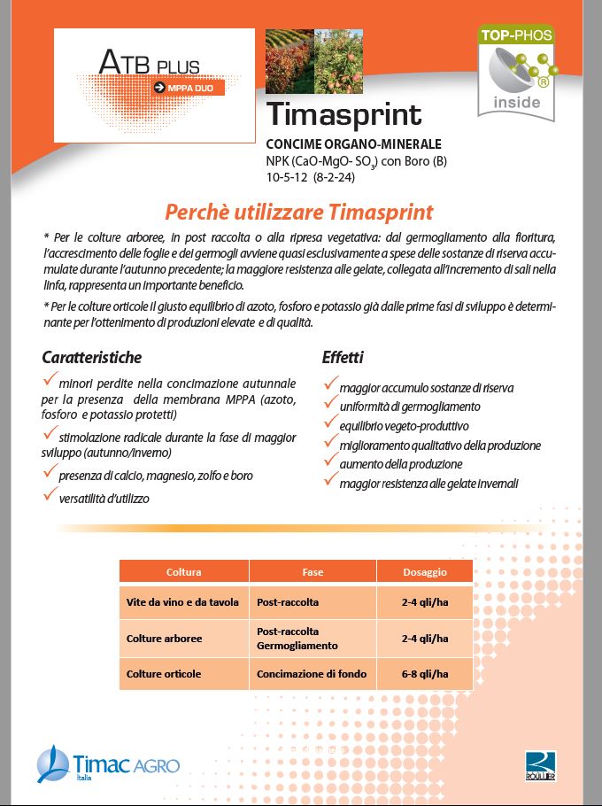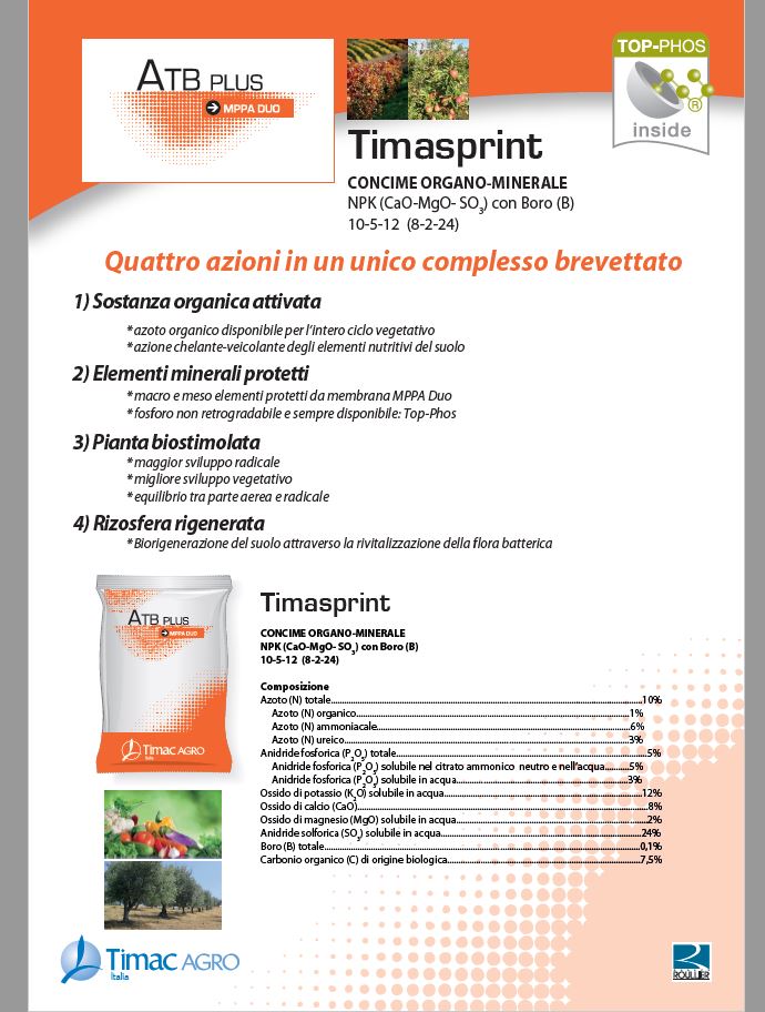 Grazie Hyspa, sempre preziose le tue risposte. Rispondo ai tuoi quesiti: - il prezzo di questo timasprint si aggira intorno ai 68 euro/quintale come puoi vedere anche a questo link http://www.simonettionline.it/index.php?page=shop.product_details&flypage=tpflypage.tpl&product_id=3294&category_id=2&option=com_virtuemart&Itemid=53 detto questo in paese potrei spuntare 3/4 euro in meno al quintale ma il costo rimane quello; Per quanto riguarda i concimi semplici invece la situazione è questa: - Solfato ammonico bianco 21% prezzo 24,00 euro/quintale; - Perfosfato semplice 19% prezzo 22,00 euro/quintale; - Solfato di potassio 52% prezzo 78,00 euro/quintale; Mi hanno inoltre proposto un altro concime TIMAC dedicato all'ulivo chiamato Humi Olivo 14-7-5, è un concime organo-minerale NPK (CaO-SO 3 ) 14-7-5 (2-23) + 7,5 + 0,01 (di cui allego qui sotto l'etichetta). Sembra particolarmente indicato per l'olivo, con una buona quantità di zolfo oltre al prezzo che risulta essere molto interessante, ovvero 38,60 euro/quintale. Secondo la tua/vostra esperienza, considerati i prezzi e le prestazioni dei concimi avrei due domande: - quanta quantità di concime NPK (in kg) o concime semplice dovrei dare ad ogni pianta che ha circa 50/60 anni di età in base alle analisi che ho precedentemente postato? - considerato il rapporto qualità prezzo, che concime useresti o utilizzereste? Vi ringrazio tutti in anticipo e vi auguro una buona serata