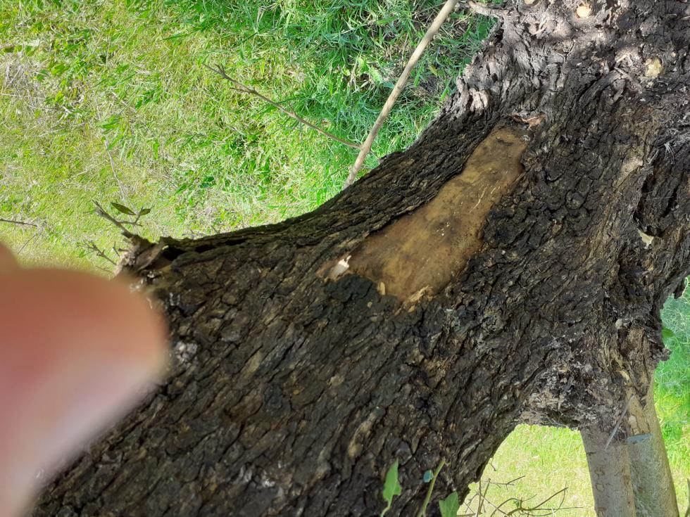 La corteccia la potresti tagliare, con coltello affilato e disinfettato, fino alla parte in cui si mostra incollata al tronco. Nel punto del taglio si può poi spennellare un pò di poltiglia bordolese più densa del solito.