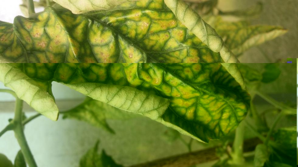 Sembra carenza di magnesio, l'arrotolamento delle foglie puo essere dovuto alle temperature elevate che si sviluppano dentro la serra. Hai messo l'ombreggiante sulla serra nei periodi piu caldi?