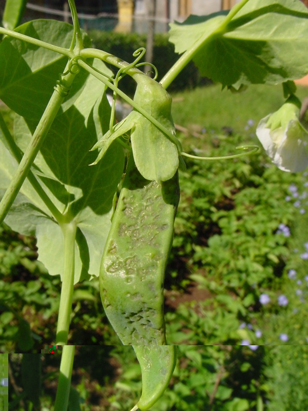 Che cavolo hanno questi piselli? Antracnosi o quel che è? I primi baccelli erano sanissimi, adesso stanno spuntando questi che vedete nella foto, e mi attaccano anche i baccelli sani. Faccio ancora in tempo a fare qualche trattamento tipo verderame o zolfo? I piselli sono al 70% in fiore ... ei baccelli nascono già malati la percentuale di tisici untori sta aumentando ...