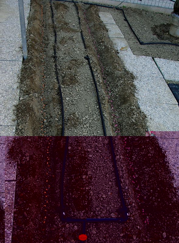 Nella prima immagine, la fila di pomodori vicina al tubo principale è irrigata da un gocciolatore posto su esso mentre la fila lontana lo è da un tubicino collegata al tubo principale?