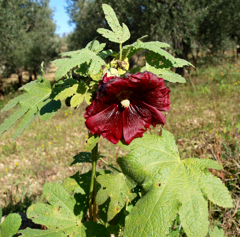 E' abbastanza comune anche Althaea officinalis, ma ci si può imbattere pure in varietà selvatiche di Althaea rosea. Quelle selezionate per scopo ornamentale spesso hanno fiori doppi, mentre quelle spontanee hanno fiore semplice (ma potrebbero essere anche ibridi di varietà coltivate come quella allegata che assomiglia un po' alla varietà Nigra e che presenta sulle foglie sintomi di ruggine: foto da Acta plantarum).