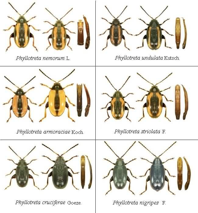 Le larve dovrebbero vivere nel terreno. Sono gli adulti a provocare i danni alle foglie. Queste sono alcune specie di Phyllotreta: (fonte http://www.agroatlas.ru)