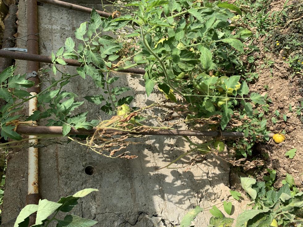 Ho queste piante di pomodoro, piantate a fine aprile, si trovano a 600 m SLM e vengono bagnate 1 volta a settimana e sono al riparo da una piccola tettoia. Cosa può essere questo appassimento anomalo.