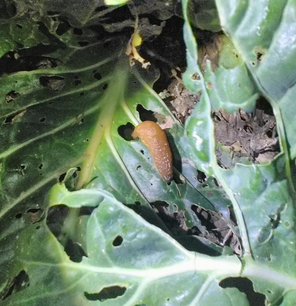 Detto fatto: sono di ritorno dalla passeggiata perlustrativa notturna, e mi pare che queste foto mostrino in modo convincente la responsabilità dei fori sui cavoli dell'appezzamento da me visitato (ho trovato danneggiamenti in pratica solo dal lato verosimilmente più umido del campo).