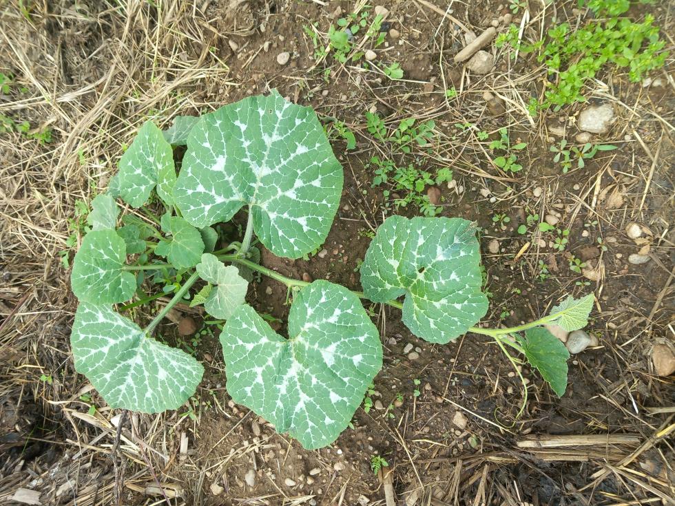 Ciao a tutti, volevo chiedervi se riuscite a capire che tipo di zucca è dalle foglie, vi metto qui sotto la foto. Questa pianta mi è nata spontaneamente nell'orto quindi probabilmente sono semi che erano all'interno del letame che ho fatto spargere nell'orto. Io ho altre piante di zucca che ho comprato al mercato ma il colore delle foglie è uniforme. Questa piante invece ha come delle venutere più chiare come da foto. Fatemi sapere se la riconoscete.
