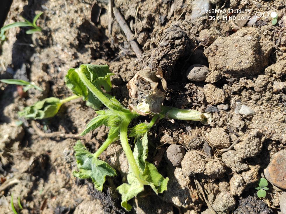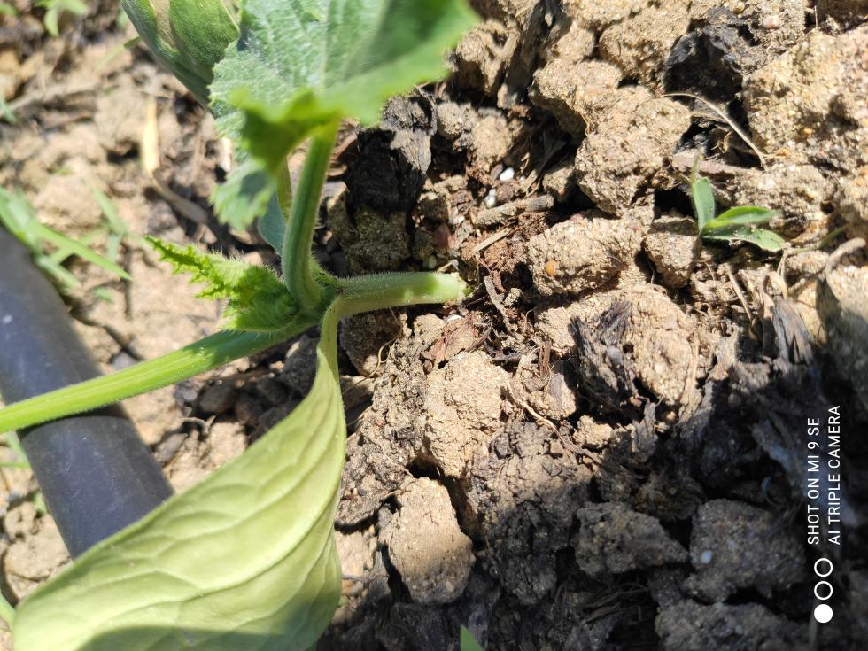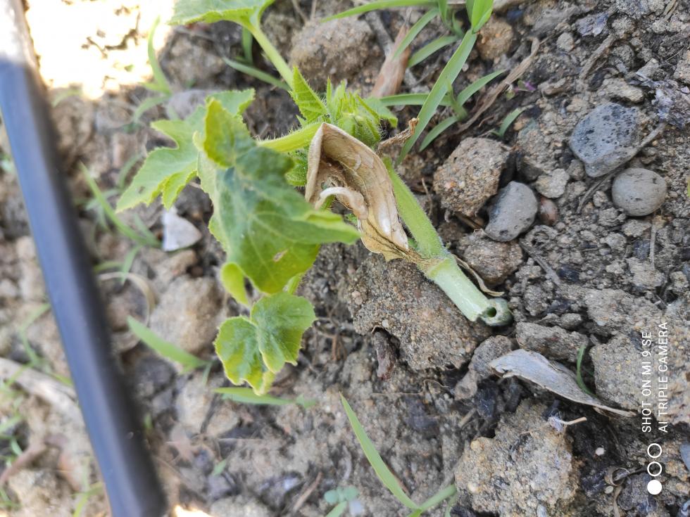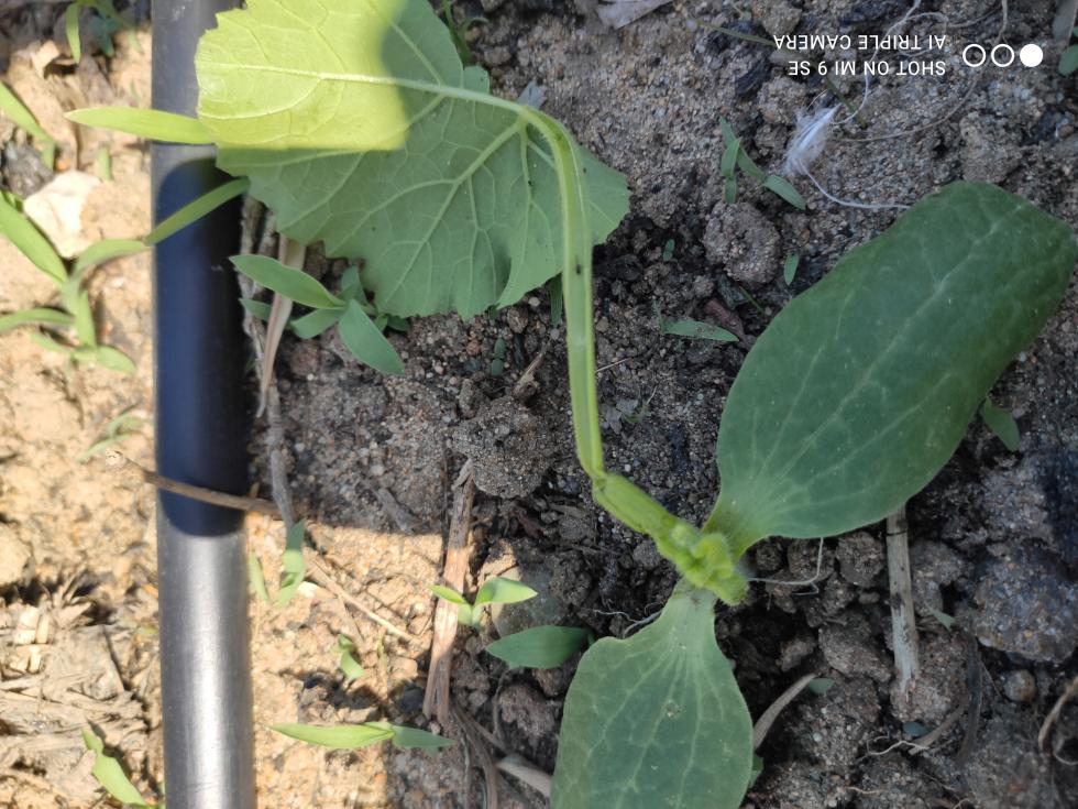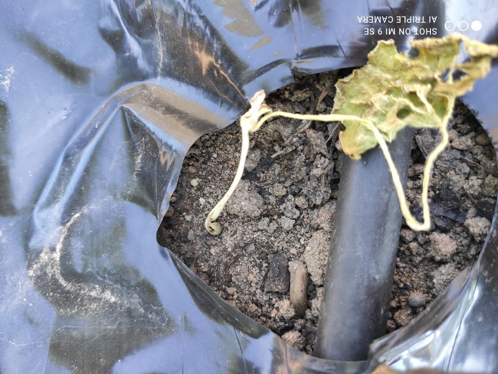 dopo 11 giorni le piantine rimesse in piedi con la carta gommata sono ancora vive, il cetriono va a rilento ma la zucchina cresce bene