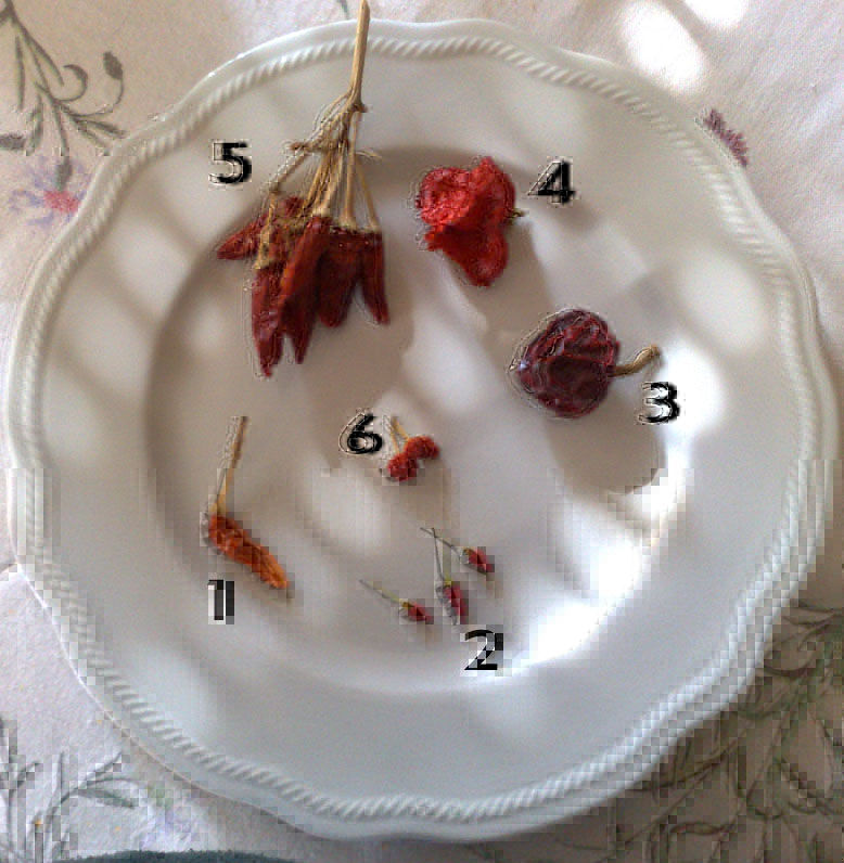 salve,il n 6 in calabria li chiamiamo buttunelli (bottoncini) il n 2 cancarinelli che significa molto piccanti e di solito prima di diventare di colore rosso,nascono di colore viola poi giallo,poi arancione ed infine rosso, il n 3 non so come si chiama ma qui si usa x farlo ripieno con un impasto di tonno,capperi,aglio,pezzetti di olive,sale, origano e dopo mettere nei vasetti ricoperto di olio.