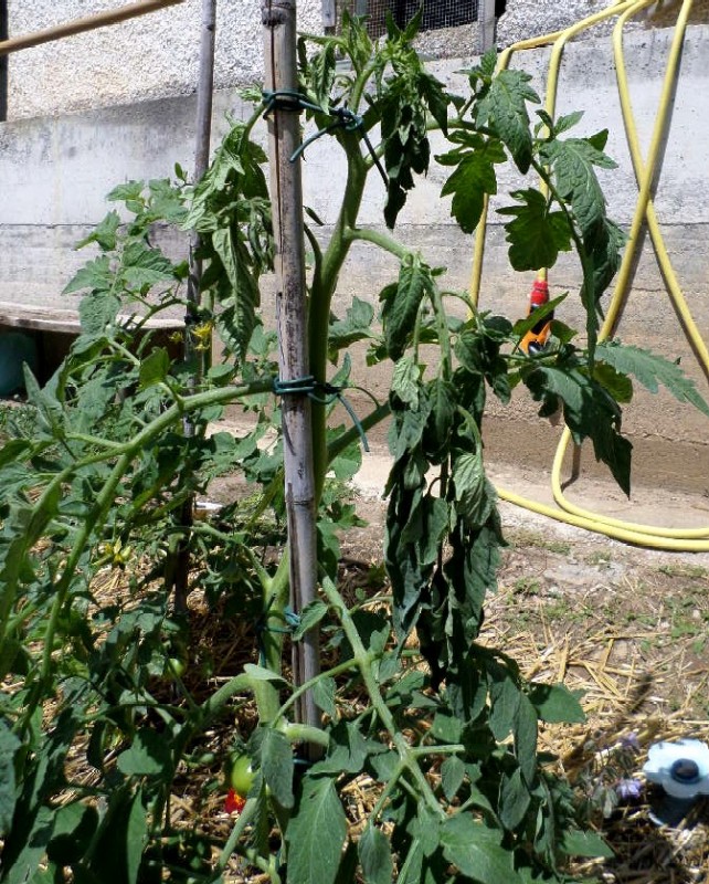 Ora però -purtroppo- nel giro di una sola notte il quadro è peggiorato! La prima pianta della fila (nero di Crimea) sta mostrando segni di appassimento a partire dall'alto. E ancora una volta non ho la minima idea di cosa possa essere -a parte la molta acqua che si è andata depositando nel terreno. La pianta è perfettamente verde, senza macchie, porta fiori e anche già frutti...Secondo voi devo provare a lasciarla così ancora per 24 ore almeno o potrebbe essere qualcosa di contagioso per le altre e sarebbe quindi più saggio estirparla subito?