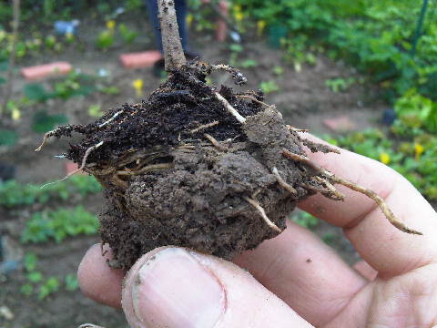 Questa qui sotto è una piantina di peperoncino di almeno 2 mesi. Le radici sono ancora raccolte intorno al panetto di terra originale. E' rimasta piccolissima anche se è già a fiore:
